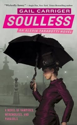 I've been *waiting* to see what SOULLESS was all about. With the byline being, "A novel of vampires, werewolves and parasols" combined with a mechanized contraption in her hand and fancy goggles on her hat, I thought this might be up my alley. Reading Gail Carriger's author blurb sold me on the book.