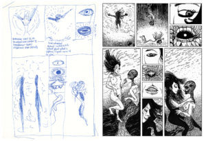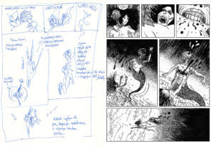 Na wypadek jednak gdyby te obrazki nie był warte tysiąca słów, śpieszę z wyjaśnieniem. Otóż na zwykłym brystolu położona z piórka kreska staje się mechata, prawdopodobnie zależy to od tego, że piórko kładzie dosyć grubą warstwę tuszu w kresce i ten tusz się rozlewa. Stare Morfołaki były rysowane innym narzędziem, Isografem Rotringa (taka naleciałość ze studiów jeszcze). Rysując ołówkiem lub mazakiem naturalnie takiego problemu nie ma. Tego nie widać na powyższym skanie całej planszy, ale zapewniam was, od razu to zauważyłem gołym okiem i wiedziałem już, że projekt upadł. Jednak będąc twardym zawodnikiem brnąłem dalej podczas tej dwudziestki czwórki, głupio było opuścić kolegów i koleżanki w boju. Wtedy powstało łącznie siedem plansz, które wszystkie posłużyły jedynie jako szkic do porządnych, albumowych plansz a potem poszły do kosza. Zostawiłem sobie tylko tą, na okoliczność tego właśnie artykułu o jednej planszy przez wieki. Ale to nie wszystko. Problemy techniczne to tylko jedna strona medalu. Druga – to problem, z braku lepszego określenia – psychologiczny. Widzicie, Morfołaki to cykl który był rysowany, jak już wcześniej napisałem – bez opamiętania, bez ładu i składu i stricte do szuflady, lub obiegu kserowanych zinów, których było wtedy może kilka w całej Polsce. Nowy album miał być rysowany prosto do wydania albumowego podczas festiwalu komiksowego w Warszawie, wydany w twardej okładce i na kredzie. Jak więc widzicie – problem polegał na tym: jak narysować komiks do szuflady, który łamie wszelkie zasady porządnego rysowania komiksów, a jednocześnie jest komiksem albumowym o statucie, nie bójmy się tego słowa – tak na wpół owianym pewną legendą. Jak połączyć podejście “pieprzyć wszystko, to i tak do szuflady” z narosłym przez lata jako takim profesjonalizmem w temacie rysowania albumów komiksowych. Tyle tematem wstępu. Pierwszym, i jak się okazało największym błędem (tuż po wyborze złego papieru) było to, że ja ten komiks zacząłem szkicować. Tak jakbym rysował Rewolucje. Morfołaki zawsze powstawały bez szkicu. Zawsze. Te naszkicowane totalnie odstawały jakościowo od starych plansz. Może nie tyle jakościowo, co charakterem. To wyglądało jak zupełnie inny komiks. A chodziło mi o to, by ten cykl rysować na tyle podobnie do starego runu na ile się tylko da, biorąc pod uwagę, że minęło 15 lat. Tak więc to pierwsze podejście do powrotu spaliło na panewce, a ta plansza to jedyna pamiątka z tej porażki. Idźmy dalej.