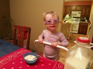 This photo is several years old, but that’s my youngest up there, approaching dinner in protective goggles. As if my carefully and lovingly prepared meal were out to get her or something. And, yeah, that’s a bowl of cereal in front of her.
