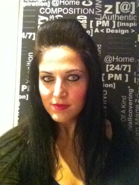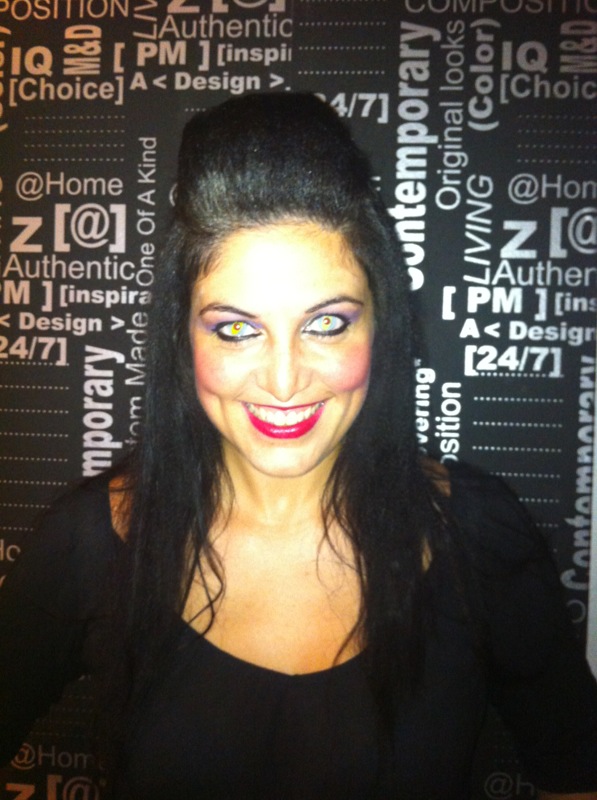 Bueno, mi peinado... Pensaba: "Ahora es cuando la gente pasará por mi lado chasqueando el Nou Noooou Noooouuu". Pedazo tupé, oiga. Lentillas de gato, kohl muy negro y rasgado y sombras lilas. Resultado: pues este.