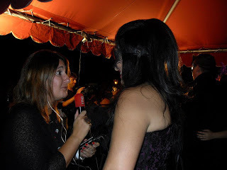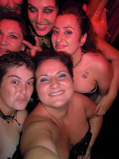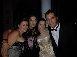 Y que corra el cava en la limu, y la música y el sonido de alguna que otra costilla reajustándose... Y la música a tope y mi Liah S. Queipo hablándome al oído, y yo que parecía lerda y me estaba asfixiando contestándole todo el rato: "¿Qué?", en plan abuelo el inistol. Llegamos al Club Atlántic. Casi todos afuera para recibirnos... Yo oyendo un pitido en mi oído. Salgo de la limusina y ¡viva la alegría! Besos y abrazos, y tocado al suelo. "¿Dónde está mi tocado?". ¡Debajo de las faldas de Melanie Alexander, como si fuera un "Caganer" con colmillos rubio y deslenguado. ¡Jajajajajaja! Sorry, Mel. I love you.Foto tocado en mano: