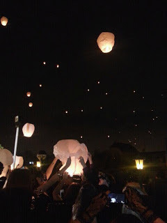 Y los deseos de doscientas y pico personas volaron por Barcelona. Los deseos de todos, positivos (espero) y llenos de luz. Alguno chocó contra una sombrilla, y otros golpearon el tejadito... Jijijijiji... ¡Aaaaarghhhh! ¡Oooooohhhhh! Se oía de fondo. Y los bomberos con un tic ocular. Pero todos los globos se elevaron y colmaron de luz un cielo oscuro y despejado. Seguro que esto lo ha grabado algún ufólogo y lo ha colgado en youtube con etiquetas como: "Avistamiento ovni en Barcelona". Después de los globos de Cantoya, ¡¡¡empezó la fiesta!!!¡Y qué fiesta!¡Cómo me reí! ¡Cómo lo disfrutamos! ¡El tchecherereche pasará a la historia por ser el baile más descoordinado de todos los tiempos! ¡Y bien orgullosos que debemos de estar, porque hacerlo tan espantosamente mal debe de ser un honor! ¡Jajajajajajaja!Y mis cotorras (qué loquitas estáis), mis nonnes, mis vanirias, mis talifans, mis Hope Girls (por Dios, cada vez que me acuerdo de Espe ojos bicolor y colmillo tetil me harto de la risa. Esa Bego, esa Noe, y todo el equipo... Me fascináis). Mis malignas que os adoro tanto tanto... Uffff. Voy a llorar. Todos los chicos tan guapos, todas las mujeres dando el Do de pecho (nunca mejor dicho). Fueron tantas cosas que esto es muy poco para poder explicaros qué sucedió. Cuelgo solo algunas fotitos, ¿vale?Estoy montando un video de la mascarada con fotos e imágenes en movimiento... No os prometo nada, pero sí muchas carcajadas.GRACIAS, ¡GENTE GUAPA!