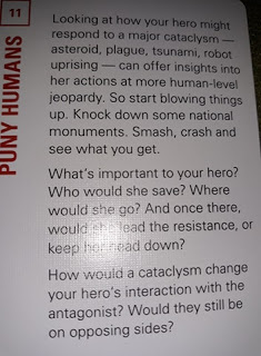 Looking at how your hero might respond to a major cataclysm- asteroid, plague, tsunami, robot uprising- can offer insights into her actions at a more human-level jeopardy. So start blowing things up. Knock down some national monuments. Smash, crash and see what you get.