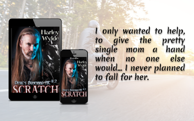 Scratch – The young woman and kid I find sleeping outside of my club’s chop shop make me feel things I shouldn’t. Hell, she’s younger than my damn daughter, but it’s obvious she’s been to hell and back, and she’s still fighting. There’s fire in her soul, but the gentle way she treats her son leaves me wanting things I shouldn’t. Like a new chance at a family. What the hell would she want with a man thirty years older than her? When I took her home with me, I never counted on wanting to keep her. I’ll slay her demons, bury the monsters from her past, and then I’ll do the one thing I thought I’d never do… claim an old lady, then make her my wife.