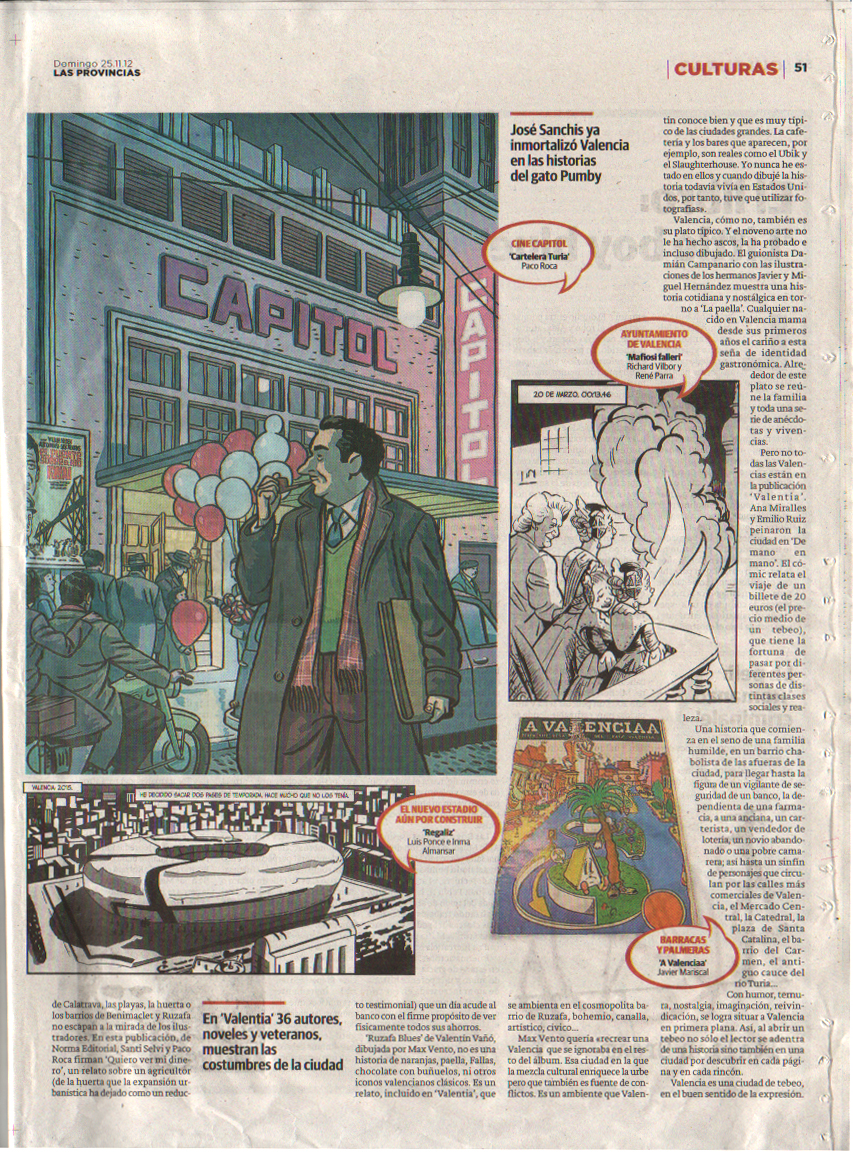 donde se abraza con orgullo el hecho de que Valencia sea escenario de diversos cómics. Tres páginas impresas que repasan la historia del cómic valenciano, desde el mítico Pumby hasta los éxitos de Paco Roca y Salvador Larroca, y terminando con nuestro cómic Valentia del que se habla ampliamente. Uno tiene la tentación de preguntarse si, no será la reciente publicación de este álbum lo que ha propiciado el artículo.