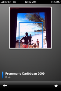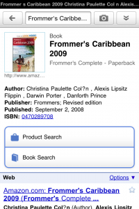 In addition to landmarks, the program also recognizes book and album covers, with links through to Amazon and iTunes. Below is a shot used as Frommers cover, and Goggles identified and linked to the book.