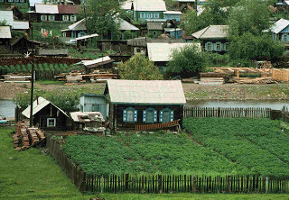 Gardens in Villages from the Trans-SiberianIn the countryside life is even simpler. Standing in the narrow hallway of the compartment car of the Trans-Siberian train, I stare out the open window for hours as we pass through lovely countryside. The train slows for small villages and towns. There I see old log homes and yards filled with lovingly tended gardens of potato plants and tomatoes and cabbages and carrots and beets. These are like our Victory Gardens of World War II years. For most people here those vegetables are vital for survival in long and bitter winters. There are rundown fences, houses in need of paint, dirt streets, and weedy lots. And yes, horse drawn wagons and carts. I feel at home here.