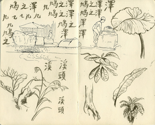 I kept seeing lizards of different sizes and patterns scurrying around, so I would either take a photo or draw depending on how long they stayed still for me. The largest one stayed still so long that I first took a photo with my digital camera - then my film camera - then did a quick sketch - and then got greedy and got very close for a detailed sketch (see above). Finally after ten minutes of my unwanted attention, this lizard flung itself towards me and landed in the middle of my path just a few feet ahead! I was surprised that even when I walked towards it, it didn’t budge. It was not happy with me, but a nice Frenchman happened to come along right at that time and the lizard promptly scampered away.