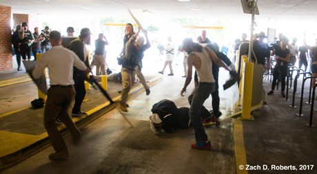 Above: Alex Michael Ramos, Dan Borden, and three more unidentified males brutally assault school teacher De'Andre Harris in a parking garage in Charlottesville on August 12. Photo: Zach D Roberts.