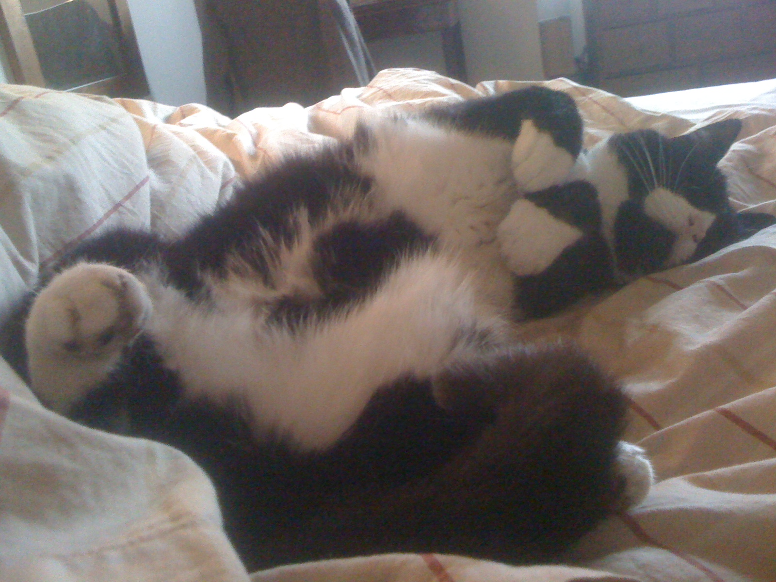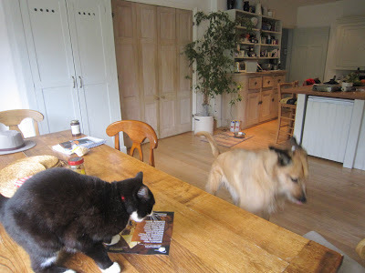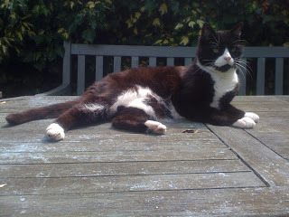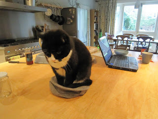 We discovered very quickly that Rascal was a Cat of Character. He particularly loved milk (though it upset his stomach) and used to appear regularly at breakfast, sitting bolt upright at the table on an empty chair and waiting for the moment when he could reach out to swipe some cereal from an unfinished bowl or surreptitiously dip his paw into the milk jug. (He would eat catfood from the tin with his paw too.) If caught in the act, he would immediately look away or pretend to be washing himself. And when I went to visit a friend in the next road, he would follow me through the neighbours' front gardens, miaowing all the way, then wait by her front door until I'd emerged and he could accompany me home again. Perhaps he thought I might get lost.