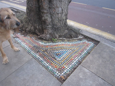 The flowerbed in the pavement outside the tapas bar, which has been painstakingly decorated with beer bottle tops.