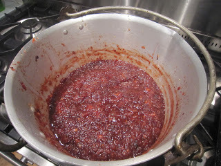 Halve and stone the plums, cut them into rough chunks and put in the pan with the roughly-chopped skinned tomatoes. Peel, core and quarter the apples and whizz them in a food processor with the onions, preserved ginger and raisins. Add these to the pan with the chopped or minced garlic, and stir in the sugar, vinegar and salt. Lastly, add the pickling spice tied up in a square of muslin.