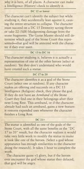 A character can make a DC 17 Intelligence (History) check to identify the god of the Stone Court this statue represents. On a failure, they still identify the statue but damage it in the process of examining it: