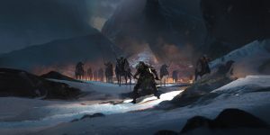 Wadim Kashin created mythical landscapes, including the lost Stone Court, the great mountain and several other scenes depicting areas and events across the mythical landscape of Grimnir.