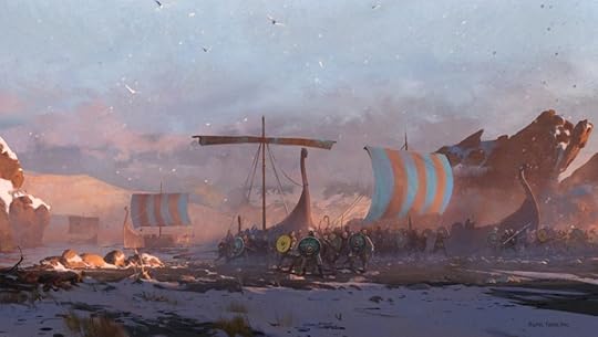 Erikas Perl created the landscape artwork depicting raiders storming across a beach towards their unfortunate victims.