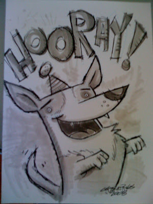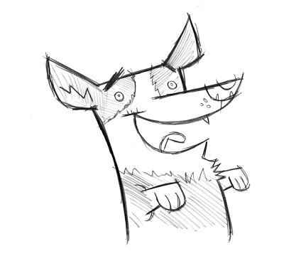 I was noodling in the sketchbook and this fella showed up. If there was color, you would see he has a long nose ... but really. He is sort of corgi, but missing the corgi thing that makes a corgi a corgi. Probably what I would do were I do take this to final is stretch him out a bit and turn his head so we could all see that super sweet corgi nose. Corgi!