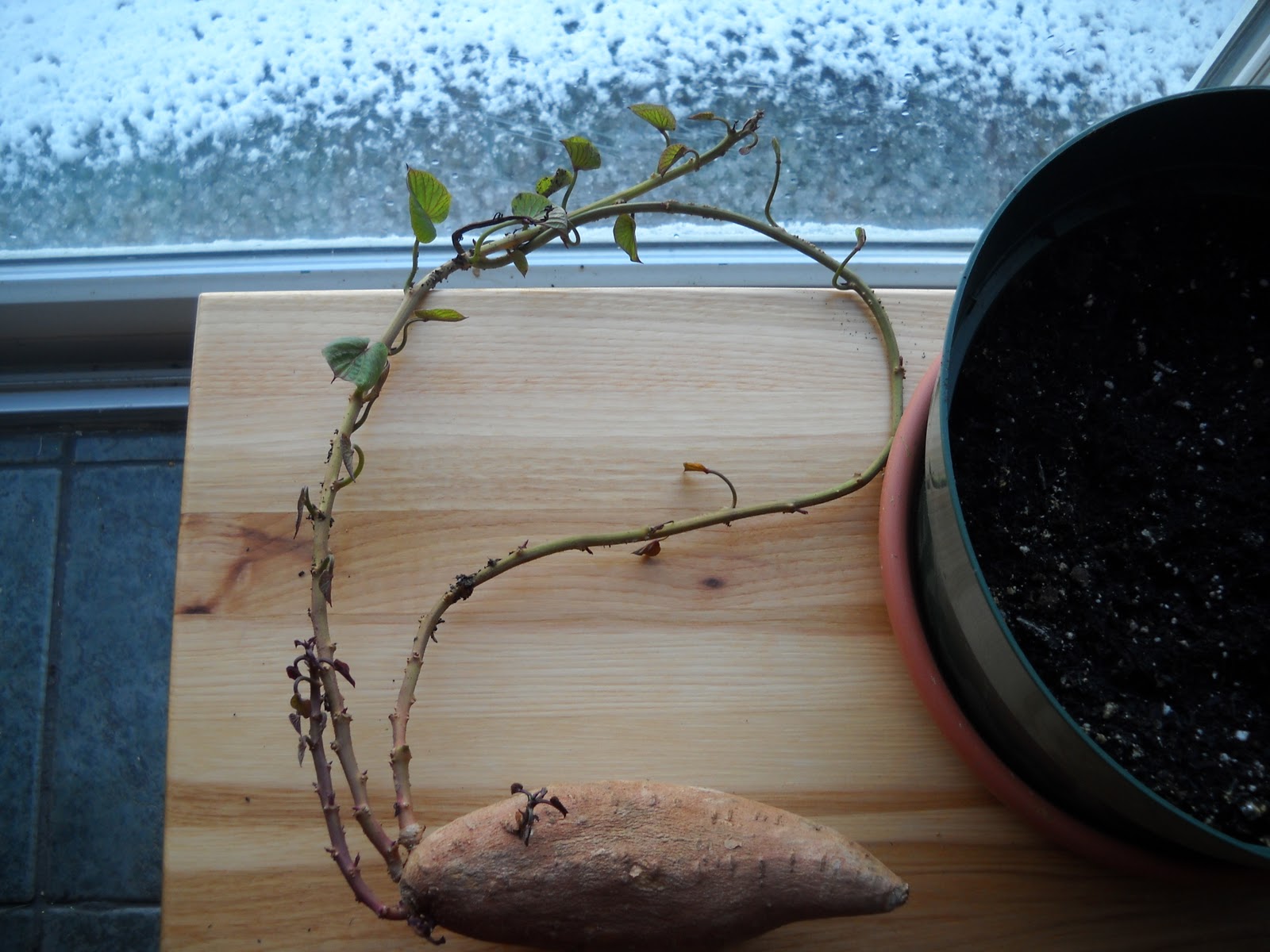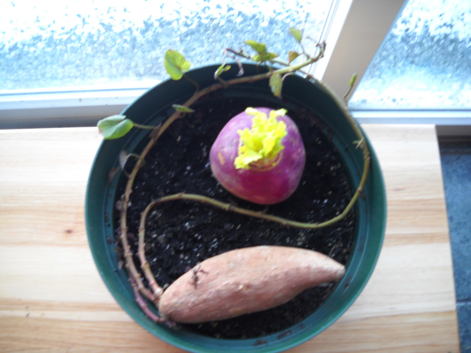 For months, since May I think, I've brooded about a frickin' sweet potatoe that refuses to rot, die, content to live in a ceramic dish without water or soil. In December, I thought to show compassion. I laid the damn thing across a pot of moist, fresh soil giving this concentration camp survivor full assess to at least a four star restaurant. Sigh. January 31, I lifted it. No roots, no rot, just strong turgid leaves and stem. Well, now it's a race to see if turnip decays, kills, mates with, or ignores sweet potatoe who will obviously outlast the cockroachs when armageddon happens.