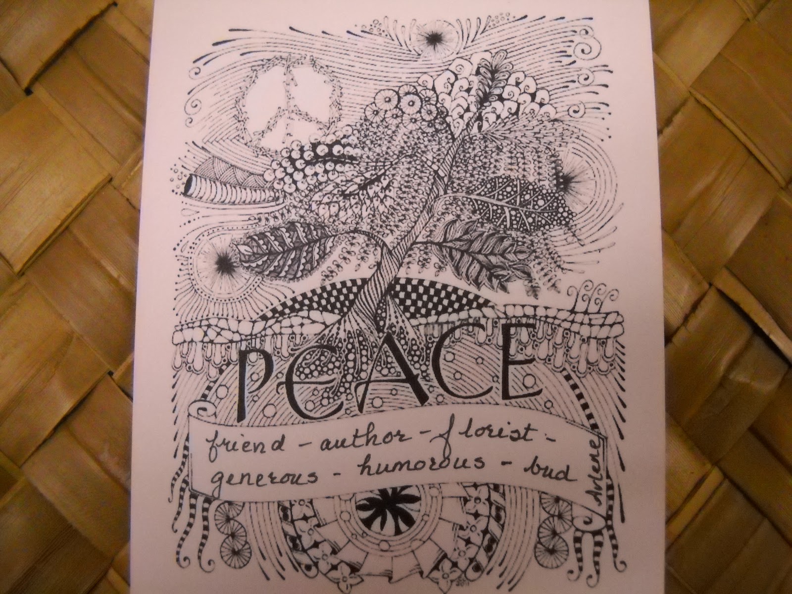 My masterpiece.Hm, head isn't humming. Does that mean right and left hemispheres have put down the swords? If so, the theroy behind zentangle pumping up right brain function is off, as far as this brain is concerned. There is a certain stillness, calmness in knowing patterns exist without confinement, and from a basic grid, curve, open or closed circle, hell I bet I could sneak in squares, comes whatever choas the pencil stroke wants, and at whatever speed. Fast and thin worked for me. Others had alot of white space and damn, their patterns didnt look like they'd each had a shot of vodka, but hey whatever it takes for me. Brain waves cooperating predicts the electric bursts, repetition of the stress of the day can be confined to a little square tile.