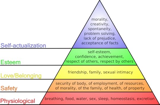 Last week someone tweeted this image, and my demented mind made a connection. Maslow's Hierarchy of Needs certainly wasn't new to me, Psych 101, but I looked at it with new understanding. Suddenly the question as to why good people cheat was answered for me. The basic concept behind this famous pyramid is that unless the Basic Physiological needs are met, one cannot proceed to the Safety needs. If no Safety, then they cannot proceed to the Love/Belonging, and so it goes up the pyramid.