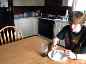 The dishwasher held the deck beneath the boy’s chin, who proceeded to not so much blow as snort.