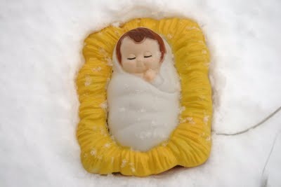 My Baby Jesus is back where he belongs now, safely tucked just under the living room window with ma and pa watching over him. And also two carefully placed stakes holding him in place.
