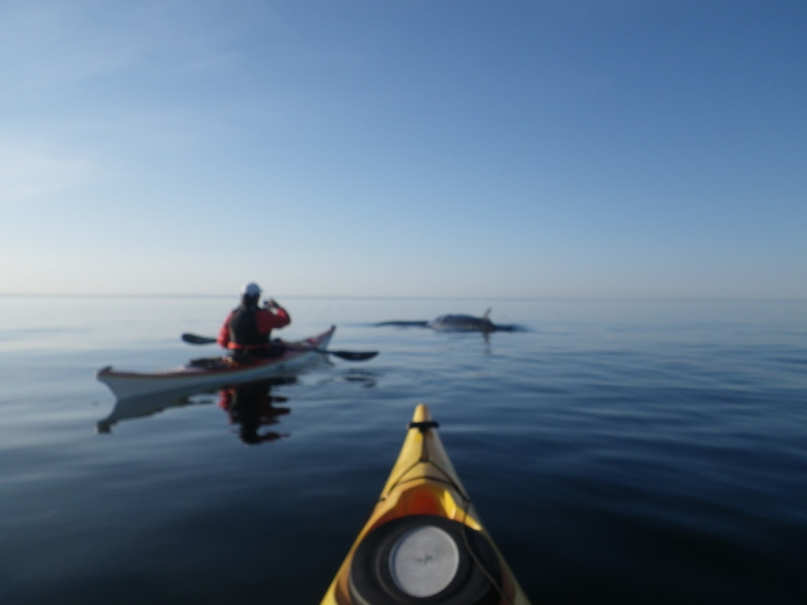 Two minke whales in a feeding frenzy. This photo was taken just before they got way too close erupting out of the water in a chaotic fashion and we had to back paddle post haste. Notice we are already rafted together with our kayaks to feel more stable and safe.