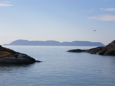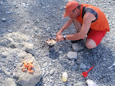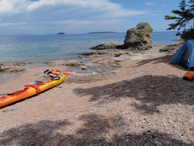 man-eating waves and wipe-outs = bruises, lost sunglasses, and a gallon of water ingested. But wicked fun!trout-infested waters allowing for delicious fresh shore-lunch served on rock platterscaribou sightings! Five in total, and one morning finding tracks less than a foot from our tenta rather bumpy paddle in confused 3' seas through the fog along massive cliffs along west side of Slates. Amazing! And scary as heck!EAGLES everywhere and a cool geological formation called shatter cone