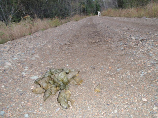 Right at the end of our driveway - an impressive pile of wolf poop. And I mean a PILE. This can't be from just one animal, therefore this required a community effort. What does this message mean?