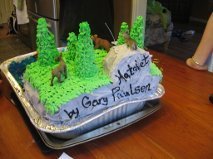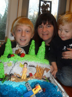 My friend Christine Selinger and her son have done something that I think deserves some kind of award. Her son's favourite book is Hatchet by Gary Paulsen, and for his school project, Chris decided they should use cake. Yes, this is totally edible, and indeed, was eaten that very day by the class.