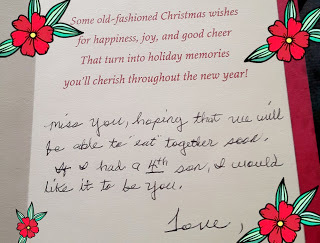 Mom gave this card to my husband for the 2020 holiday season. The words she wrote at the the end make my heart smile. Before the pandemic, my husband joined us at Mom's for Sunday dinner after worship services. But Covid-19 caused him to use extra precaution for her safety, especially because she's an octogenarian. She follows the safety rules. He wants to be extremely careful about her exposure to extra people. He follows all the safety rules too, and he'd be heartbroken if she's mistakenly exposed to the virus. They miss each other at the family meals. They've built a strong mother-in-law/son-in-law relationship over the years. It touches my heart. Like my late father said about my future husband years ago, "Tony's got a good heart." Mom agrees.Smiles from Sylvia