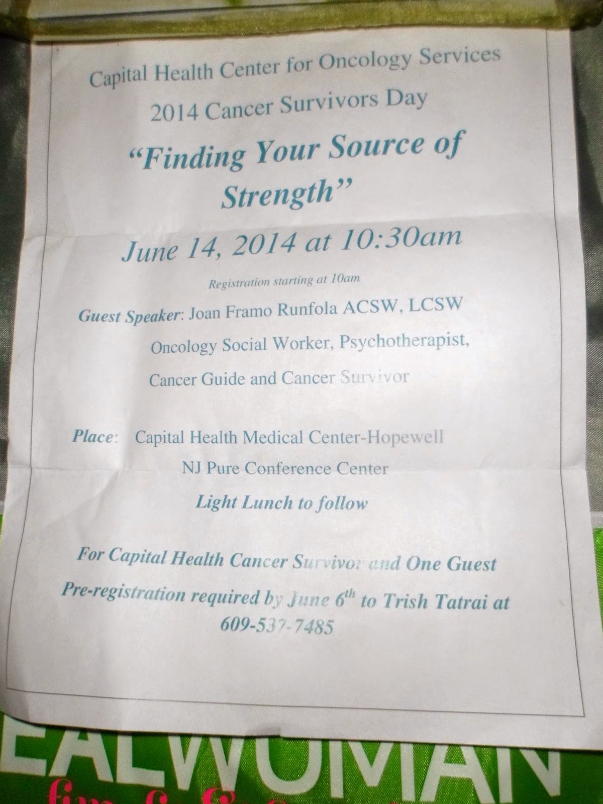 Did you attend and come away glad that you did attend? This happened to me last Saturday. Capital Health Systems for Oncology Services held a 2014 Cancer Survivors Day: Finding Your Source of Strength event. I waited until the last minute to register. I've had a blessed first year as a survivor. I know the Lord Jesus is the source of my strength. Why should I attend? I found out why.