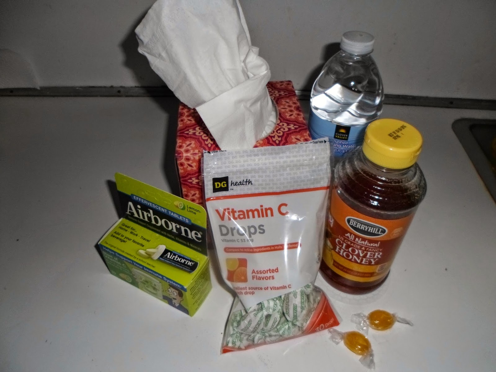 One week ago today, I was sidelined by a cold. This is rare for me. I taught elementary school for so many years that I encountered most cold viruses and bacteria via my students. My body had a chance to grow lots of immunity. Since retirement from teaching, I've had much less exposure to children's sniffle germs. I guess I've gotten soft in that department. Last week, I didn't get lots of writing done, missed 3 gym workouts. My singing voice lacked the higher register. No energy. Not cool. Yet, blessings abound, and I feel pretty much like myself today! Pictured is my home regimen, accompanied by lots of rest and prayers: tissues, cough drops, water, vitamin-packed (C and others) fizz-making tablets, ginger tea with honey.