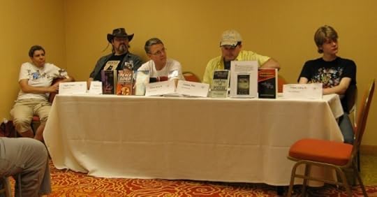 Saturday morning started at 10AM with "Good and Evil in Genre Literature". Author David Wood moderated. The panel was comprised of Robert Chase, Robert Katz, and Patrick Thomas. Audience participation was enthusiastic. Discussion topics included characters motivated by pure evil, those forced to perform unsavory acts against the few for the benefit of the many, and whether we preferred writing protagonists that were pure and heroic (i.e. Superman) vs. those with flaws (i.e. Indiana Jones, Han Solo, Peter Parker).