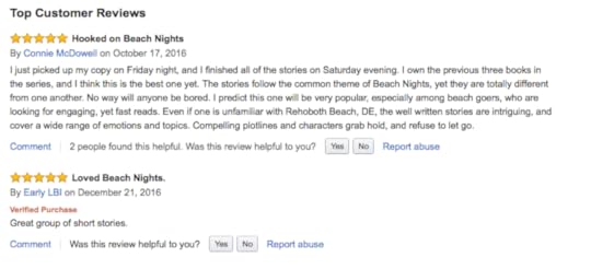 The screen capture below shows two Amazon reviews for Beach Nights, a collection of short stories from Cat and Mouse Press that contains my paranormal tale, “Tower Sixteen”. The book was published in October 2016.