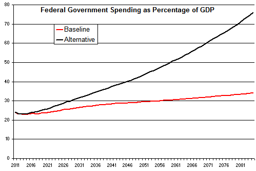 According to the Congressional Budget Office's 2011 Long-Term Budget Outlook, the federal government will consume 34.1 to 75.9 percent of GDP in 2085. The lower number is called "The Extended-Baseline Scenario" while the higher number is "The Alternative Fiscal Scenario," which includes the extension of the tax cuts set to expire, rising debt levels, and "spiraling interest payments."
