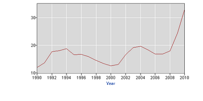 The other disheartening statistic is reflected in the chart combining the unemployment, marginal and discouraged workers (in short, everyone who is not working but currently or at one time wanted to work, or who is employed part time because full time work was unavailable). Combine all those and the total is 16.6% up from 16.3% November not seasonally adjusted (seasonally adjusted it is 16.7% down from 17%). This is the highest number since 1994 (first year data available):