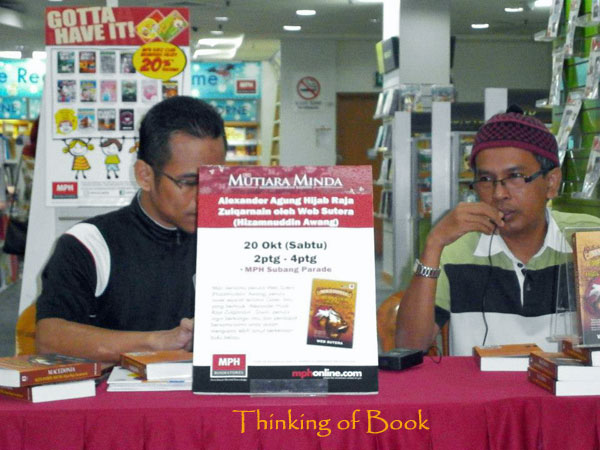 ** Foto atas: Saya (kanan) sedang berbicara berkenaan novel sejarah Alexander Agung: Hijab Raja Zulqarnain di kedai buku MPH Subang Parade pada 20 Okt. 2012. Kredit foto untuk Galeri Ilmu Sdn. Bhd.