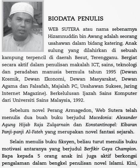 Dalam dua novel saya - (1) Konstantinopel: Kibaran Panji-panji AL-FATEH dan (2) Perang Armagedon - kisah jihad diperikan dalam bentuk penceritaan. Niat saya ialah agar pemuda dan srikandi Islam serta rakyat umum Malaysia memperoleh sedikit pencerahan tentang isu ini. Jihad bukan kosa kata yang patut hilang dari dunia Islam atau dimomok sebagai 'jahat' atau 'teroris'.