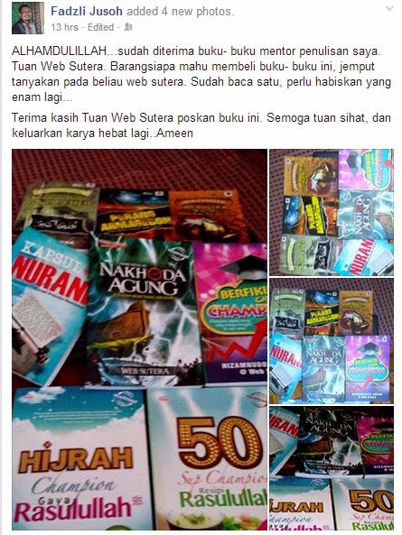 Saya menyahut, "Alhamdulillah. Saya ada kaedah tersendiri dalam menulis, mencari kelainan." Kemudian saya ceritakan bagaimana proses penulisan yang digunakan. Mahu tahu apakah yang dinyatakan oleh pembaca kepada lima orang anak itu? Sudikan untuk dapatkan novel ibrah sejarah dalam tema membongkar Hijab Raja Zulqarnain dan dakyah Zionis-Yahudi di PBS2015.
