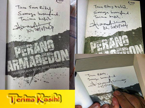 Kami berbual dan bertukar-tukar fikiran mengenai perancangan projek penulisan seterusnya. Bersolat Asar, dan seterusnya mengambil bunting pra pelancaran novel PERANG ARMAGEDON . Kemudian menerima naskhah novel yang di tunggu-tunggu. Alhamdulillah, suatu rupa paras novel yang menarik dan tampan.