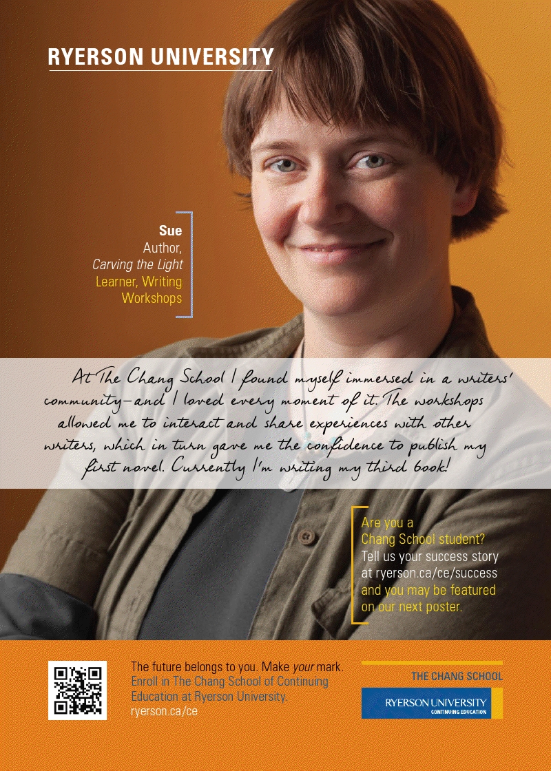 In other news, the Ryerson Chang School ad is appearing more and more frequently across the city of Toronto, on subway platforms and now in public transit vehicles all over the place. So keep your eyes peeled and cameras at the ready! The Spot The Ad Contest is in full swing, and there are tons of crappy prizes to be won! Search Carving The Light on Facebook, and this blog, for full contest details!Until soon,