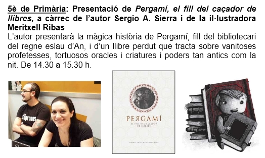 La charla la daremos en el Auditori de la escuela. Espero que nos vaya también como la que ya hicimos ayer día 18. La verdad es que la experiencia fue de lo más grata y la actitud de los niños con sus preguntas sobre " Pergamino " fueron de lo más interesantes y acertadas. Enhorabuena a la escuela.