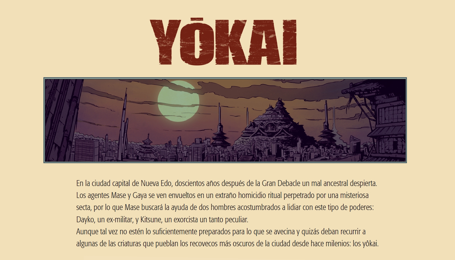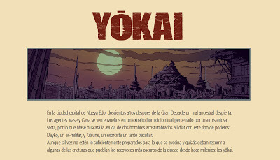 Se trata de una obra pensada para tres volúmenes. Este primer número se llamará " Yôkai - La Conspiración Heike ". Es un thriller policíaco ambientado en un Japón futurista en el que los protagonistas tendrán que lidiar con unas criaturas del folklore japonés llamodos yôkai y con una secta milenaria que está raptando niños con algún oscuro fin. Así que como podéis ver también encontraremos elementos fantásticos y de terror.