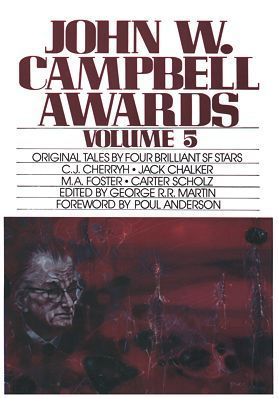 This week I am offering the trade paperback of THE JOHN W. CAPMBELL AWARDS, VOLUME 5, the last published volume in my "New Voices" series of original anthologies featuring work by the finalists for the John W. Campbell Award, honoring the best new writers in the field. If you're ever wondered who were regarded as the best new SF and fantasy writers of 1977, well, here they are: Jack Chalker, C.J. Cherryh, M.A. Foster, and Carter Scholz. Cherryh (the winner) contributes a novella, the other nominees original novelettes. There's also a preface by me, an introduction by Poul Anderson, a list of finalists and winners for the first ten years of the award, and a gorgeous Richard Powers cover.