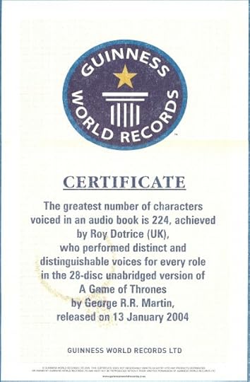 Of course, I am not sure how long this particular record will stand. In fact, I think Roy may well have broken it already with his recordings for A CLASH OF KINGS and (especially) A STORM OF SWORDS. But I will leave the Guinness people to sort that out.