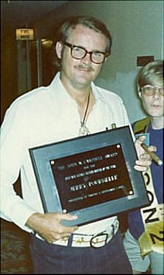 The other weirdness about that night was that toastmaster Lester del Rey, for reasons only known to himself, chose to present the awards backwards. In other words, he started with Best Novel (the 'Big One,' then as now), working his way though short fiction and to the fan awards, and ended with the brand-new never-given-before Campbell. Thing is, people started leaving after each award was given, and by the end, there was hardly anyone left in the hall except me, Jerry Pournelle and his party, and the other nominees and their friends (I think Lisa Tuttle and Ruth Berman were there, but Thurston and Effinger were not, someone else accepted the plaque for Piglet).