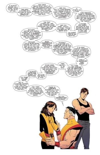 [ID: Single panel from an X-Men comic, featuring two younger people listening to the above monologue.]