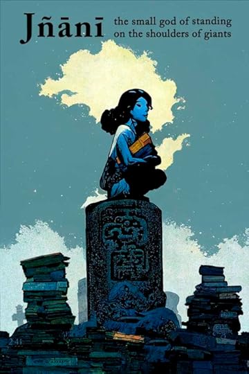[image description: A blue woman (or is it simply a blue morning?) crouches atop an ancient tombstone. She holds a couple huge books in her arms. Around her there are both grave markers and piles of books. Text reads, “#241, Jñānī, the small god of standing on the shoulders of giants”]