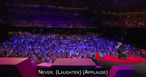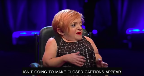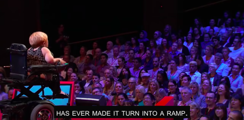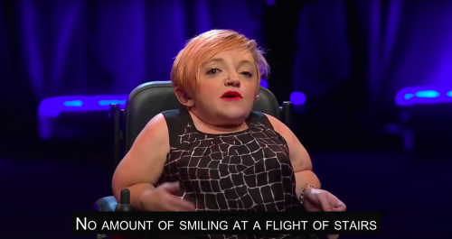[IDs: Screenshots from the late, great, Stella Young’s TED Talk: I’m Not Your Inspiration, Thank You Very Much. Stella is a wheelchair-user sitting up on the stage in front of a massive crowd. In these screenshots, she’s saying, “No amount of smiling at a flight of stairs has ever made it turn into a ramp. Never. (Laughter. Applause.) Smiling at a television screen isn’t going to make closed captions appear for people. No amount of standing in the middle of a bookshop and radiating a positive attitude is going to turn all those books into braille.]