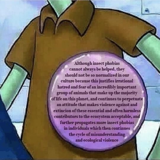 “ Although insect phobias cannot always be helped, they should not be so normalized in our culture because this justifies irrational hatred and fear of an incredibly important group of animals that make up the majority of life on this planet, and continues to perpetuate an attitude that makes violence against and extincion of these essential and often harmless contributors to the ecosystem acceptable, and further propagates more insect phobias in individuals which then continues the cycle of misunderstanding and ecological violence” // End ID ]